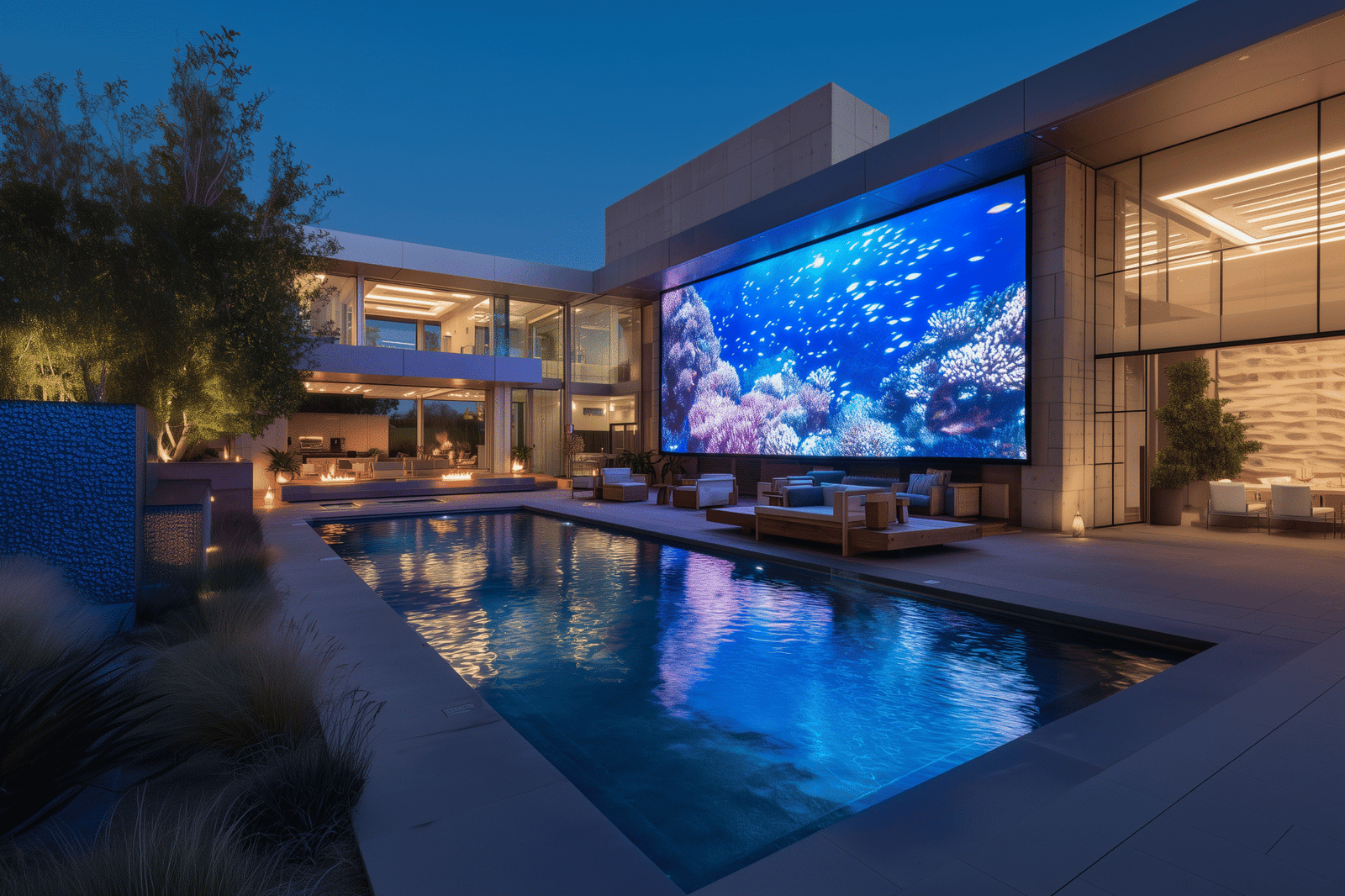 Telões de LED com alta resolução e brilho, ideais para áreas internas e externas. Imagem superior, design discreto e controle por automação.
